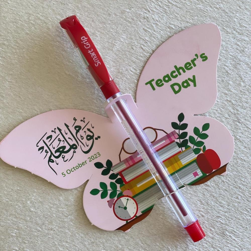قلم احمر جاف مثبت في كرت بتصميم ليوم المعلم